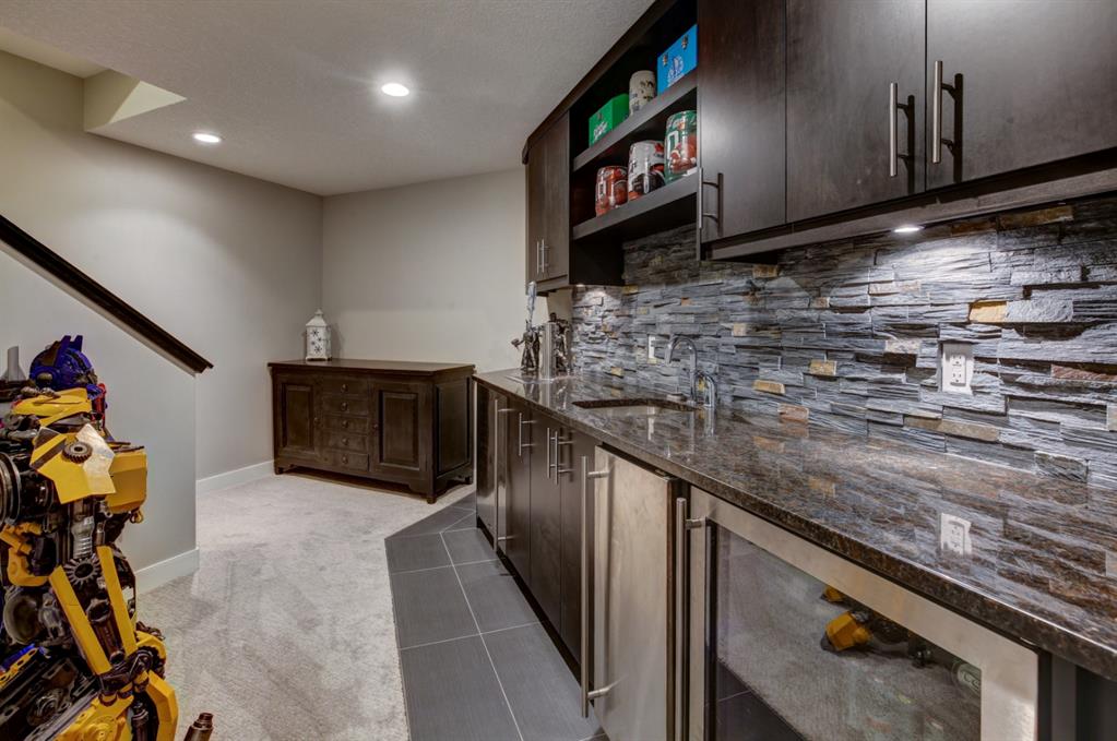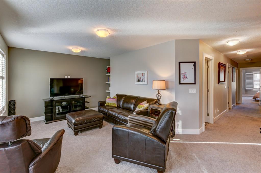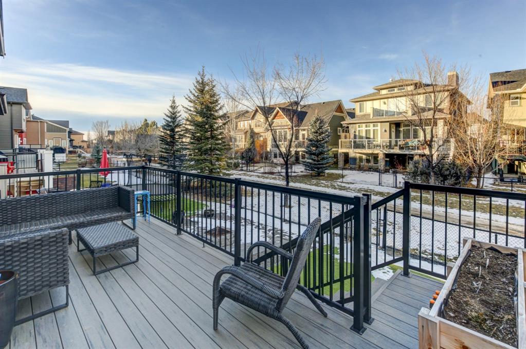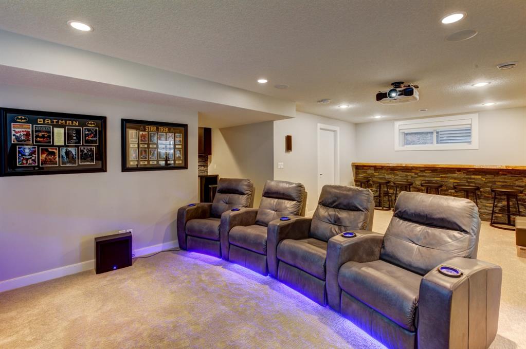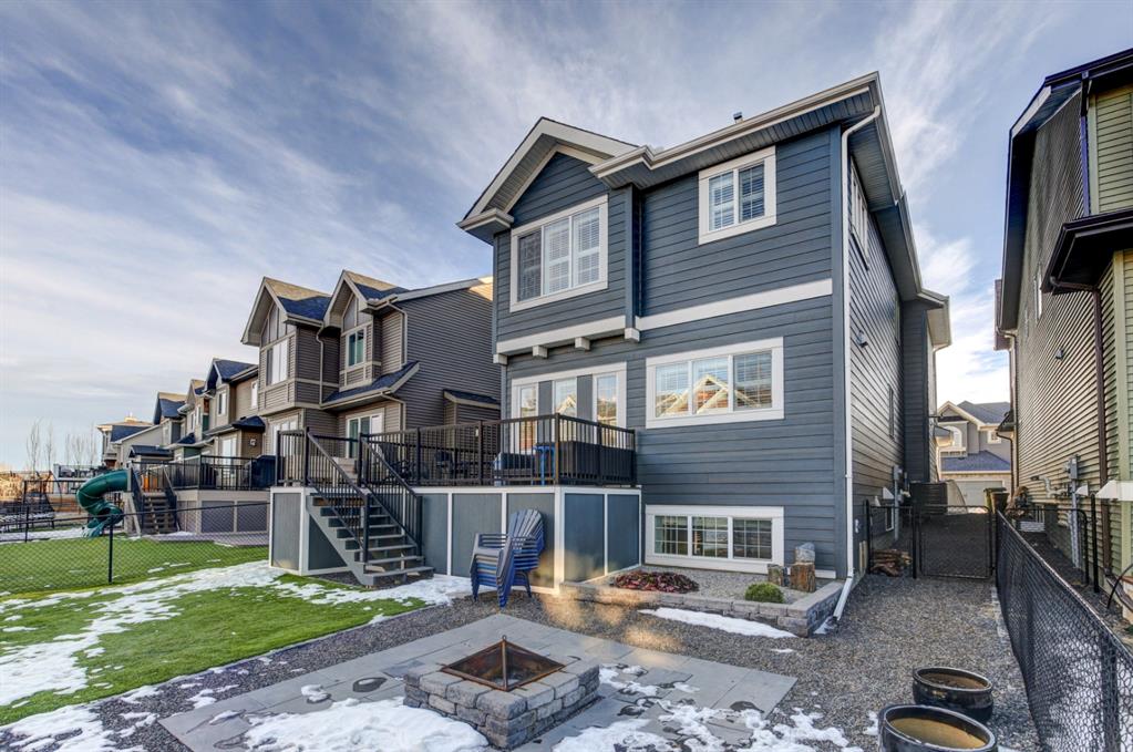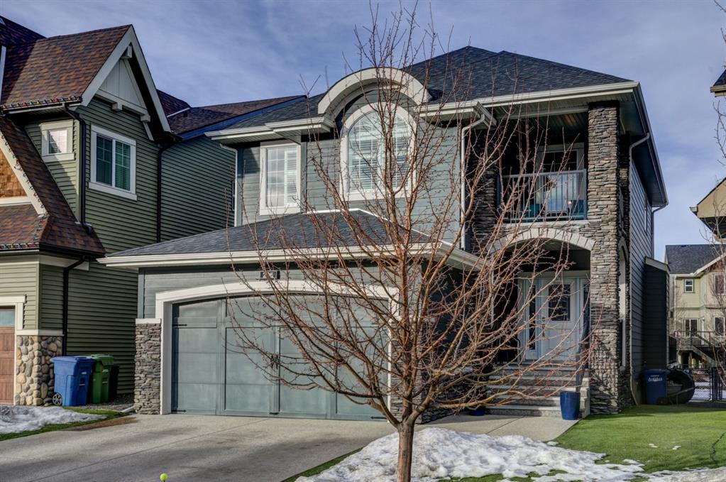 HOME SWEET HOME! Look no further, this is the extraordinary, custom-built (Mckee Homes) 2 storey family home you have been searching for backing on to a pristine greenspace in the coveted community of Coopers Crossing in Airdrie! Indulge in luxury living in this stunning home located on a pie lot offering 4 bedrooms, 3.5 bathrooms, a spacious, oversized double garage, amazing curb appeal and 3,189 SQFT of immaculately maintained living space loaded with pride of ownership throughout. Heading inside you are greeted by a bright foyer with high ceilings, den/dining room with a dry bar, office/ den with wooden french doors and a unique stone wall accent with built-in shelving (authentic solid wood slab), sun drenched family room with a spectacular tile gas fireplace, a gourmet open plan kitchen complete with ebony cabinetry, quartz countertops, center island with a breakfast bar, convenient pantry and a premium stainless steel appliance package including a built-in oven and gas cooktop, large mud room and 2 piece bath. Upstairs is complete with 2 generous sized bedrooms, a large, bright bonus room with a work space with access to a private, covered balcony with duro-deck, laundry room, a wonderful 4 piece bathroom and the magnificent master retreat with a walk-in closet with ample built-in shelving and a dreamy spa-like 5 piece en-suite with a stand alone shower and a relaxing soaker tub. The fully developed basement offers a media room with a built-in theatre with a projection screen, entertainment system and reclining chairs, an incredible wet bar with a keg tap, ice maker and wine fridge, 4th bedroom, a gorgeous 3 piece bathroom with heated floors and utility room with tons of storage space. Additional highlight features includes a built-in speaker system, upgraded lighting fixtures, a double, oversized, heated garage that has a lot of storage space and a pully system and a fenced backyard with low maintenance landscaping (lawn turf and cement firepit) backing on to a pristine greenspace and walking path to the school. Wonderful access to explore Airdrie. Close to all major amenities such as a newer elementary school, newer shopping area, public transportation, parks, major roadways and a quick drive to Calgary. This gem is a MUST VIEW! Book your private viewing today!