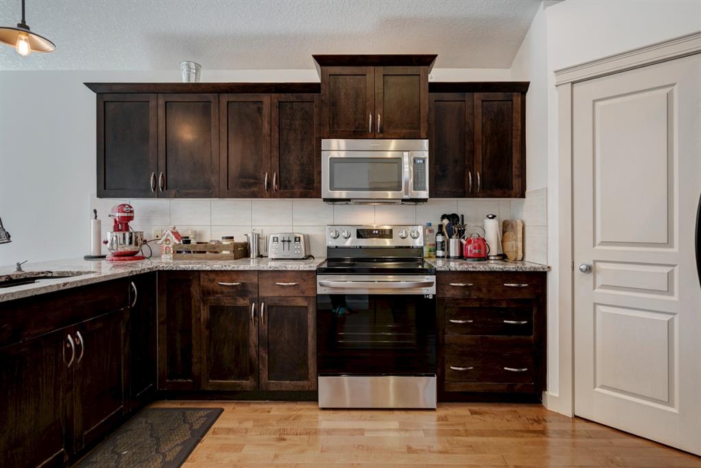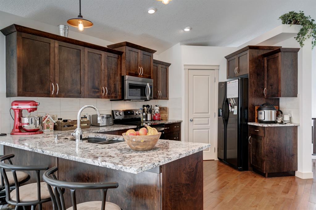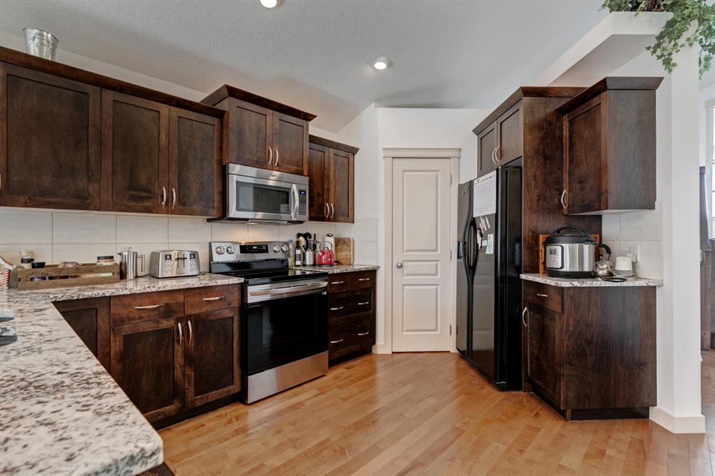 OPEN HOUSE SATURDAY APRIL 9, 2-4PM. HOME SWEET HOME! Fall in love with this upscale, spectacular home offering 4 bedrooms and 3 bathrooms with a fabulous illegal mother-in-law suite in the sought-after community of Springbank Hill in exclusive West Calgary! The main level features a spacious open plan with HARDWOOD FLOORS, LED lighting and vaulted ceilings. Showcased in the open concept main floor is a bright living room that is great for entertaining with a cozy gas fireplace, formal dining room and a gourmet kitchen with granite countertops, maple shaker cabinetry and a corner pantry. Completing this floor is a 4-pc bath, two generous sized bedrooms and a dreamy master retreat with a walk-in closet and spa-like 5 piece ensuite including a soaker tub, double sink vanity with granite countertops and an oversized walk-in shower. . The fully developed basement is ideal for family use or for a nanny or aging parents needing one level living. Features include upgraded laminate flooring, 9’ ceilings, a bright living room with a stone, gas fireplace, wet bar/kitchen with quartz countertops and stainless-steel appliances. A bedroom with a walk-in closet and a 4-pc bath with heated tile floor, gorgeous tile and a soaker tub complete the floor. Home appliances include 2 dishwashers, 2 fridges, 2 microwave hood fans, stove, washer and dryer. Outside offers an incredible PRIVATE SETTING with mature trees, partially fenced backyard, a sunny SOUTH facing deck and patio, with beautiful privacy screening, double attached garage with 14 -foot ceilings, great for extra storage and has direct access to the basement. Located in coveted Montreaux steps to Aspen Landing, close to the LRT, private and public schools, shopping, greenspaces/parks, major roadways and quick access to Bragg Creek and the mountains. Don’t miss out on this gem, book your private viewing today!